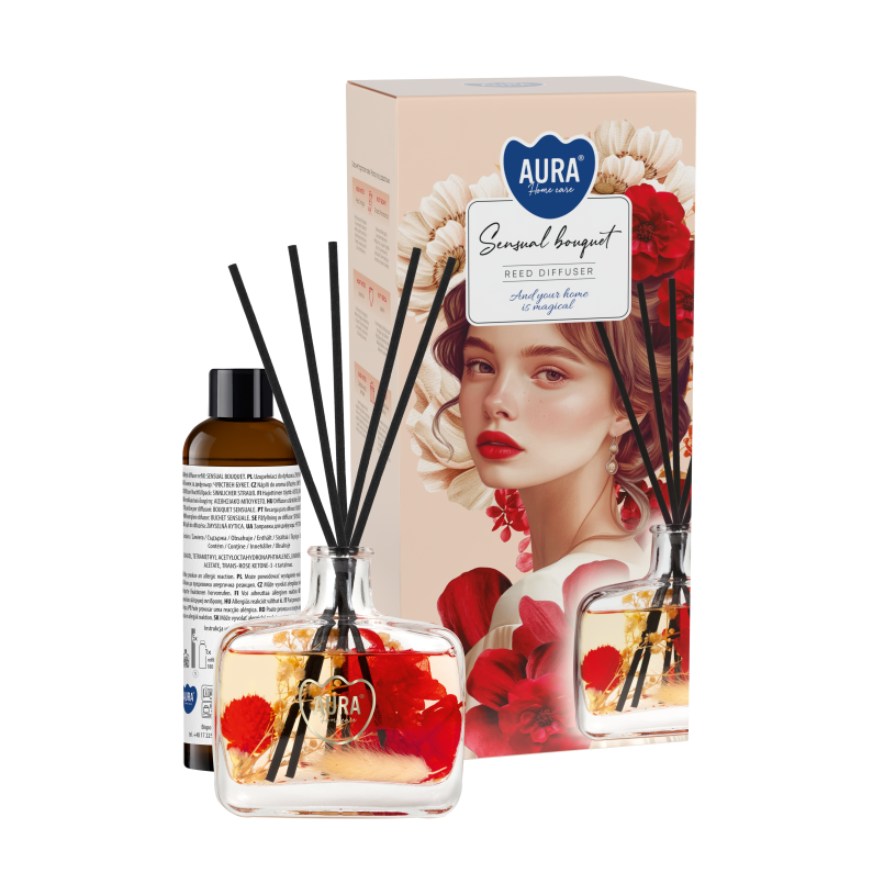 The exceptional Sensual Bouquet fragrance diffuser combines fruity freshness with an elegant floral heart and a warm base. Its stylish design and enveloping aroma create an atmosphere of comfort and subtle sensuality in your interior.